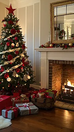 The fireplace is definitely the star of the show. It’s like a big, warm hug in the form of burning logs. Just looking at it makes you want to pull up a comfy chair and listen to the crackle of the flames. And those presents under the tree? They’re probably filled with amazing surprises, just waiting to be unwrapped! This room is the definition of Christmas spirit!