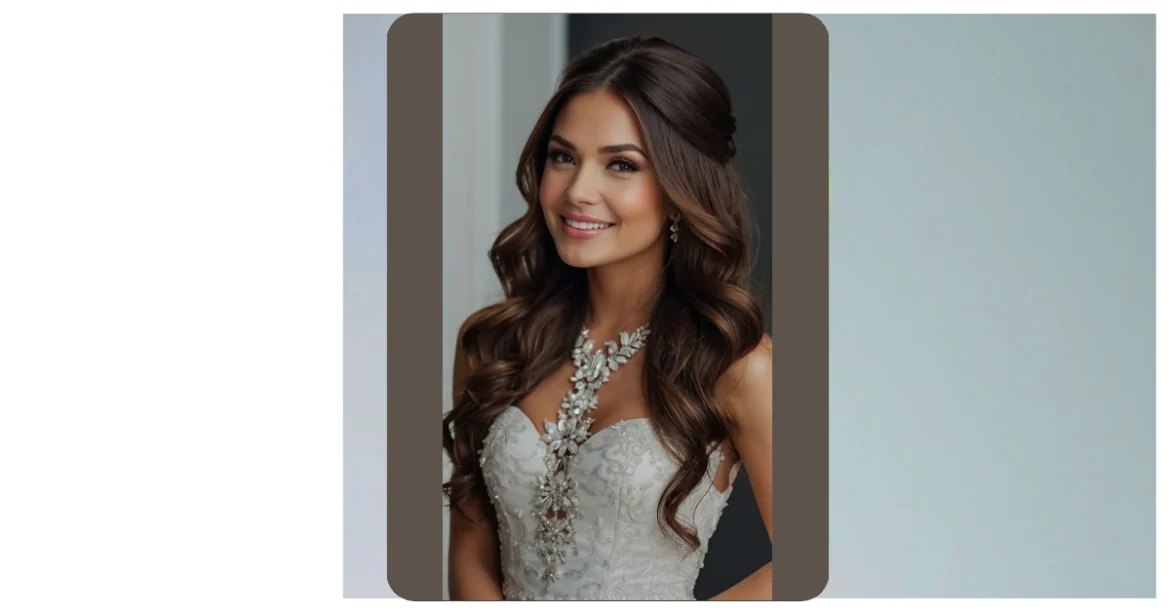 **Paragraph 1:** Check out this gorgeous bridal hairstyle! It’s totally “half up, half down,” which is super trendy right now. Imagine getting ready for your wedding and feeling like a princess—that’s exactly the vibe this gives. The loose curls cascading down her shoulders are so romantic, and the way her hair is neatly pulled back on top adds a touch of elegance. It’s like the best of both worlds: playful and sophisticated! Plus, that dress? Seriously stunning. It’s like something out of a fairytale.