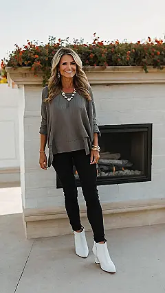 This outfit is seriously giving us all the “cool mom” vibes. The lady in the picture is rocking a classic grey sweater, black jeans, and white booties, which is a look that’s both stylish and comfortable. And let’s be honest, who doesn’t love a little bit of comfort? It’s like the perfect blend of trendy and practical, just like a good mom. The best part? This outfit is totally versatile. You can dress it up with some jewelry for a date night or keep it casual for a day of errands.