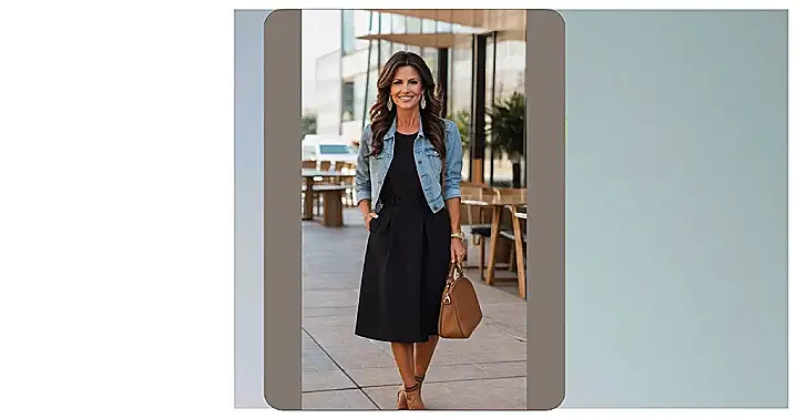 This mom is rocking a look that’s both stylish and practical, proving you can be a cool parent without sacrificing comfort. A classic black dress is given a playful twist with a denim jacket, making it perfect for running errands, catching up with friends, or even a casual date night. The brown handbag and heels add a touch of elegance, while the relaxed fit of the outfit lets her move freely and confidently.