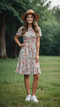 You know that tricky balance when you want to look effortlessly stylish for a picnic, but also be ready to actually *enjoy* it without worrying about your outfit? This look totally nails it! The floral dress is giving off major “I just casually look this good surrounded by nature” vibes, while that chic hat isn’t just a fashion statement – it’s practically a superhero cape against sun glares and unexpected bad hair days. It’s the kind of outfit that says, “Yes, I came for the sandwiches, but I’m also ready for an impromptu photoshoot or a game of charades.”
