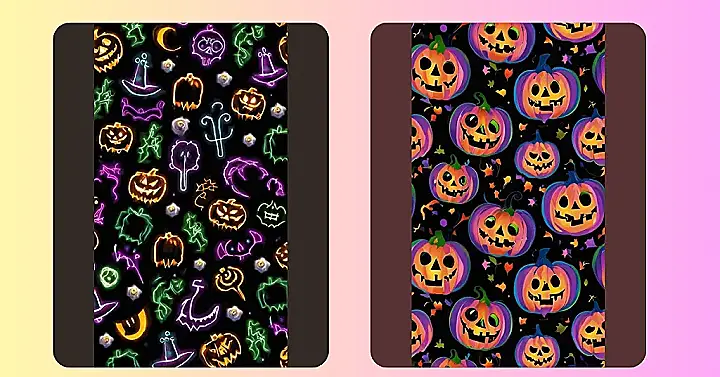 This wallpaper is like a party for your eyes! It’s filled with glowing pumpkins, spooky bats, and even a witch’s hat. Everything is drawn in bright, neon colors against a dark background, which makes it look like the wallpaper itself is casting a magical spell. Imagine decorating your room with this spooky yet fun wallpaper, it would be a perfect way to get into the Halloween spirit!