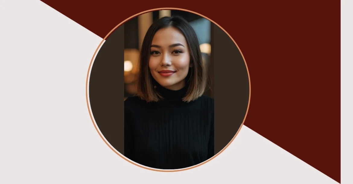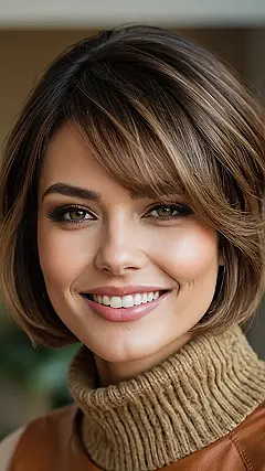 This picture shows a woman rocking a seriously awesome bob! It’s got that perfect blend of chic and playful—think stylish librarian meets supermodel, but way more fun. Her bob isn’t just any bob; it’s got layers and a side-swept fringe that would make even your favourite celebrity jealous. It’s the kind of haircut that looks amazing dressed up or dressed down, perfect for a school dance or just hanging out with friends. Basically, it’s total hair goals.