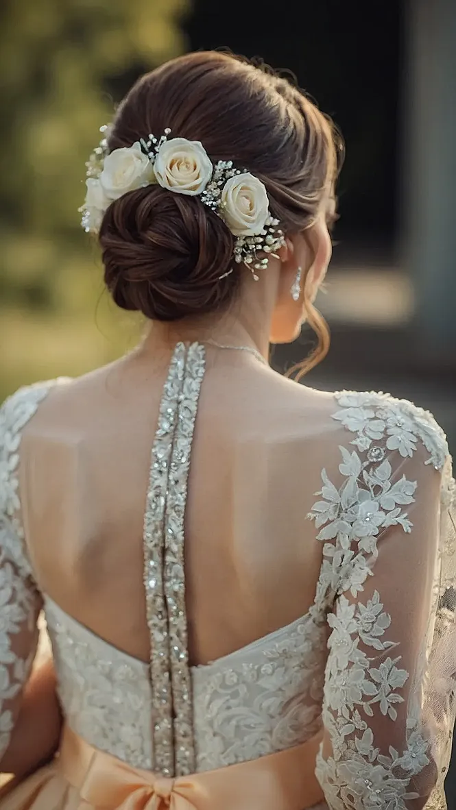 This bride is looking stunning with her hair up in a chic bun, decorated with delicate white flowers. She’s like a princess in a fairy tale, ready to walk down the aisle! That fancy lace dress and sparkling detail make her look extra fancy. It’s like she’s ready for a royal wedding in a magical forest.