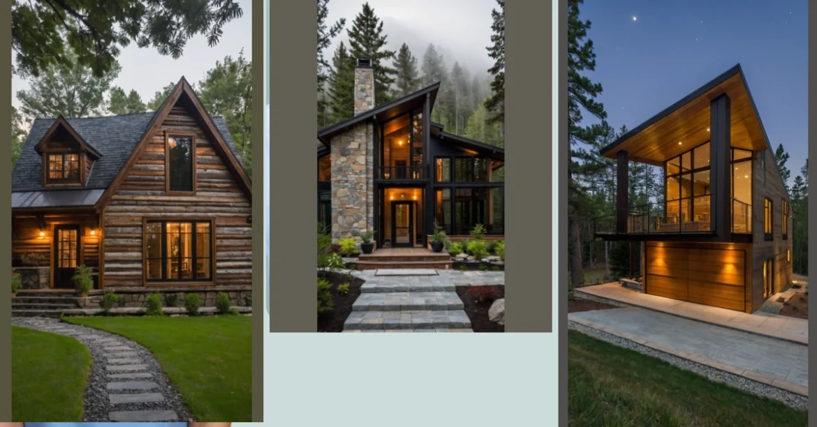 Forget roughing it! This cabin house is all about sophisticated comfort. The stone exterior is seriously stylish, and those sleek black windows add a touch of modern elegance. The garage doors even look cool! You can picture yourself pulling up in your awesome car (maybe an electric one to keep it eco-friendly?) and heading inside to your cozy, light-filled haven. This cabin isn’t just a house; it’s a statement – a statement that says, “I appreciate the finer things in life, but I also really love nature.”