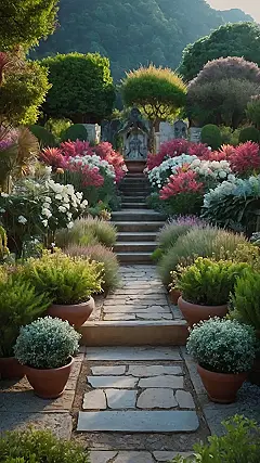 This garden is like a scene from a fairy tale! It’s bursting with color and life, from the fluffy pink flowers to the lush green foliage. The winding stone path, peeking out between the flowers, looks like it could lead you to a magical secret. Imagine walking through this garden, surrounded by the sweet scent of blooming roses, and feeling the warm sun on your face. It’s the kind of place where you could get lost in thought, daydream about your future, or just simply relax and enjoy the beauty around you.