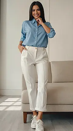 This lady is rocking a look that says, “I mean business!” A crisp blue button-down shirt is a classic choice for any professional setting, and paired with those white pants, she’s got a clean and polished vibe going on. You can totally see her heading to a big meeting or taking on a challenge at work. The key to a great professional outfit is feeling confident and comfortable, and this lady seems to have that down pat.