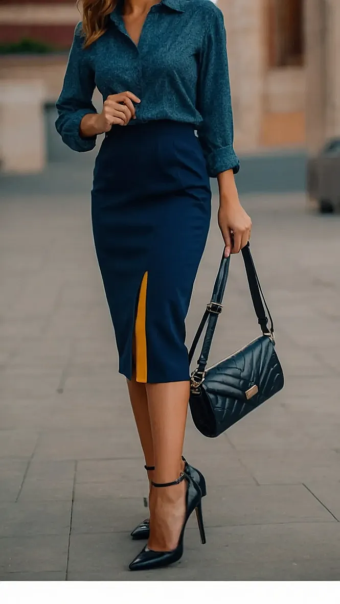 This outfit is all about feeling confident and ready to tackle anything! That blue shirt is like a power move, showing you mean business. And that skirt? It’s sleek and stylish, but that yellow stripe adds a fun pop of color. It’s like saying, “I’m here to work hard, but I’m also not afraid to have a little fun.” And those heels? They make you feel like you can walk on water. This outfit screams: “I’m a professional, but I’m also a total rockstar!”