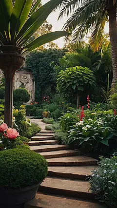 This garden is like something out of a fairytale! It’s got everything a fancy garden needs: lush greenery, a winding stone path, and even a little bit of mystery hidden around every corner. It’s like stepping into a secret world where the only rules are to take in the beauty and enjoy the peacefulness. You can almost imagine yourself wearing a beautiful dress and walking up those steps, feeling like you’re entering a magical place.