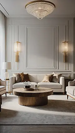 This living room is like stepping into a magazine spread, except you can actually sit on the couch and relax! It’s got all the fancy stuff you’d expect from classy home decor, like a giant chandelier that looks like it belongs in a palace. But it’s also super cozy, with a big comfy couch and a wooden coffee table that’s perfect for putting your feet up.