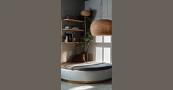 Seriously, who needs a regular bed when you can have a round one? It’s like a cozy island in your room! And with those shelves packed with books and plants, it’s clear this isn’t just a bedroom – it’s a personal oasis of chill. You could even have a sleep-over and everyone can claim their spot around the circular haven! It’s so stylish, it’s almost unfair.