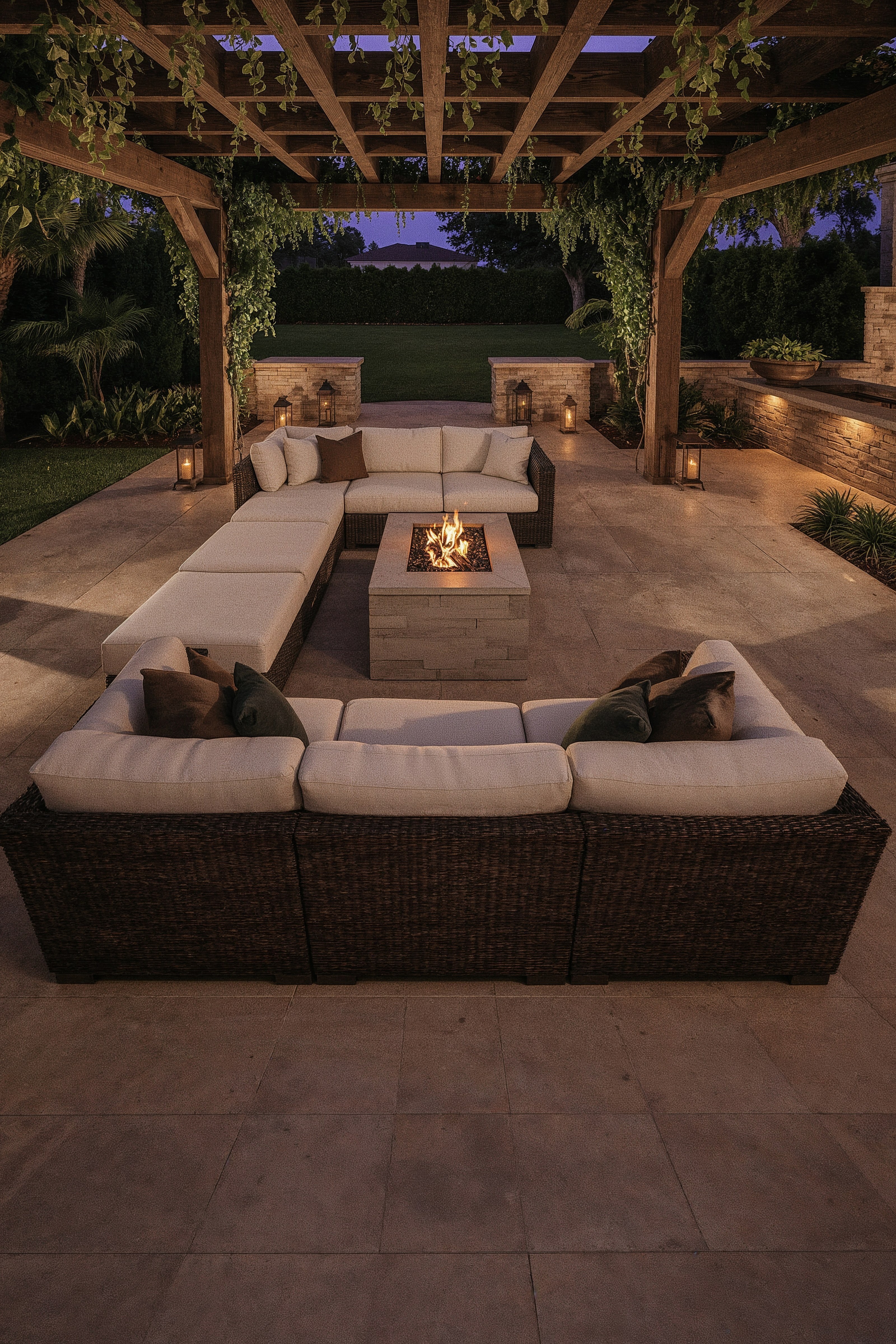 Experience the ultimate backyard renovation with this stunning outdoor patio makeover, where garden design meets the allure of a flickering fire pit. Imagine sinking into plush cushions beneath a pergola, enveloped by the warmth of a concrete fire pit.