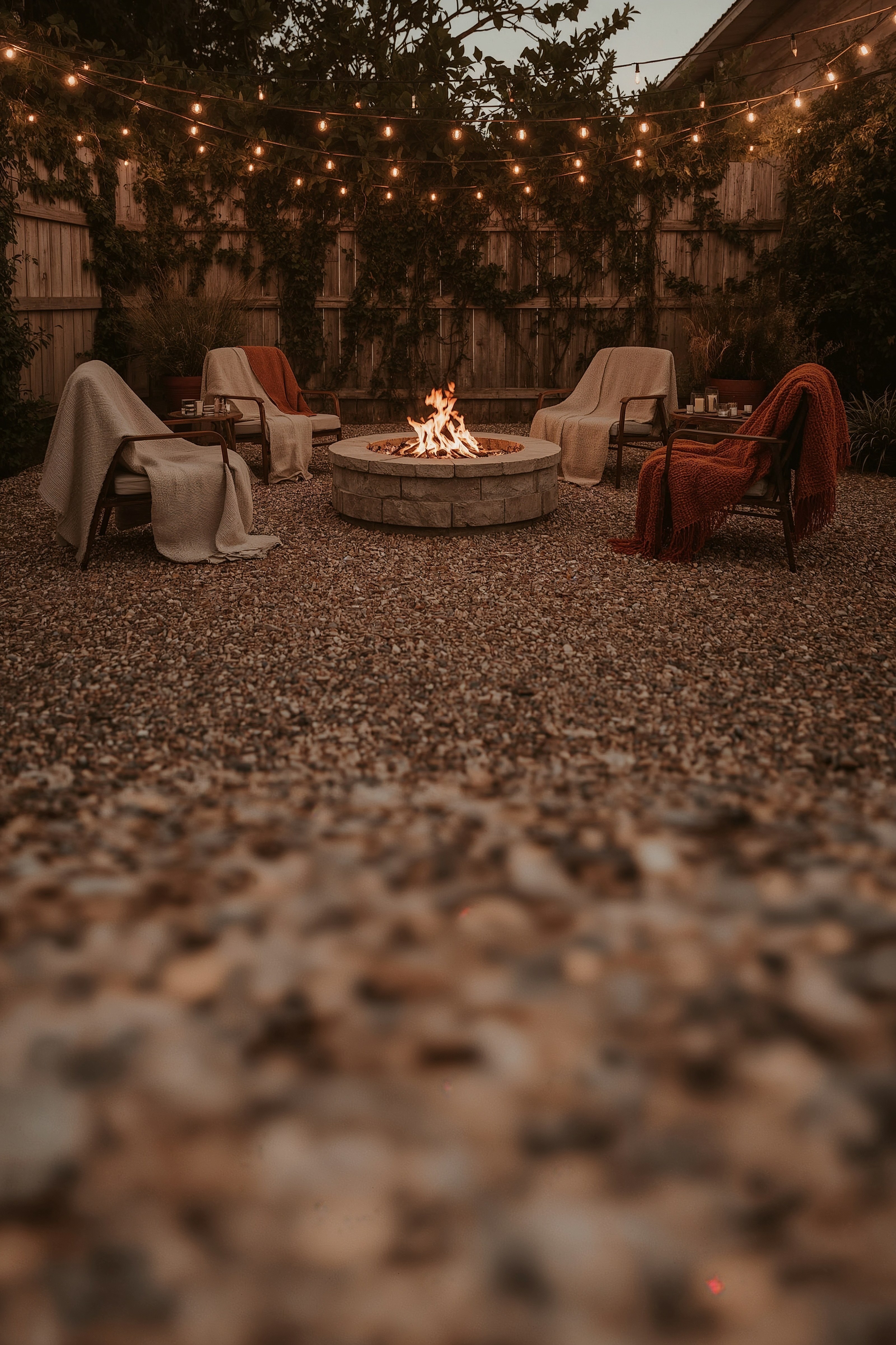 Elevate your backyard patio with these warm and inviting fire pit landscaping ideas, perfect for cool evenings. Layered textures, from soft blankets to gravel pathways and overhead string lights, create an intimate ambiance for your small fire pit area.