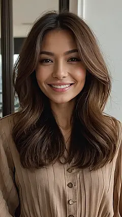 This hairstyle is totally party-ready! Imagine rocking this gorgeous, medium-layered look at your next school dance or celebration. It’s like the perfect blend of effortless cool and wow-factor glam. Those soft waves and highlights are seriously mesmerizing—they’ll make everyone do a double-take! You won’t need a tiara, this hair is the ultimate accessory.