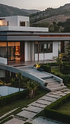 This villa is seriously cool! It’s got this modern, sleek vibe that makes you feel like you’re in a movie. It looks super chill and relaxing, with tons of windows for letting in the sunshine and maybe a little pool for dipping your toes in. The house is perched on a hill with a view of the mountains, and the curved walkway leading to the front door is like something out of a video game. You can just imagine a superhero landing on the patio, right?