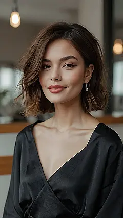 This picture shows a woman rocking a seriously chic bob! It’s the kind of hairstyle that makes you want to grab your hairbrush and try it yourself. It’s super stylish without being too fussy—perfect for someone who wants to look great but doesn’t want to spend hours in the bathroom. Plus, that subtle wave adds some extra pizzazz without making it look like you tried too hard. Imagine how amazing this would look with a pair of colorful earrings or a fun headband! It’s a total win-win!