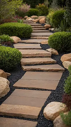 Who needs a fancy video game when you’ve got a real-life adventure path like this right in your home garden? Seriously, navigating these perfectly placed stone steps and gravel patches feels like a secret quest to find the ultimate chill spot. Just try not to get distracted by all the perfectly plump bushes and succulents acting all cute on either side. You might start talking to them, asking for directions to the snack cupboard, or wondering if they’ve seen your missing phone charger. (Spoiler: they haven’t, they’re plants, but they look like they’re judging your life choices anyway).