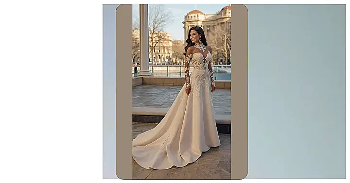 Forget those boring, plain wedding dresses; this one’s got personality! With those long sleeves and beautiful lace detail, it’s perfect for a bride who wants to look elegant but still have fun. Plus, who needs a tiara when you’ve got this stunning gown? This dress is basically a magic potion: it transforms you into the most radiant and confident version of yourself—ready to say “I do!” and live happily ever after.