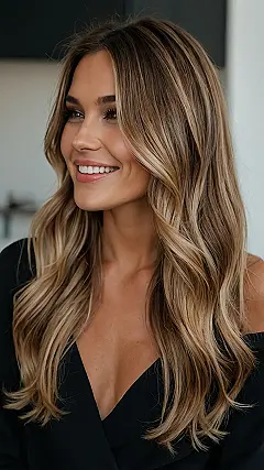This girl’s hair is seriously giving us major hair envy! It’s like she just rolled out of bed looking absolutely flawless. The “bronde” balayage, a mix of brown and blonde, adds dimension and depth, making her hair look super lush and healthy. It’s like a perfect blend of sunshine and autumn leaves, all in one gorgeous mane! It’s no wonder she’s smiling so big – she’s rocking a hairstyle that’s totally on trend and flattering.