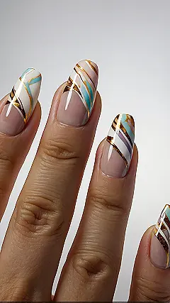Those golden lines aren’t just there for decoration; they’re like the VIP ropes separating the ordinary from the extraordinary! They pull together the soft blues, pinks, and whites, making everything pop and giving off major luxury vibes without even trying. These nails are basically telling everyone, “Yes, I’m sophisticated, but I also know how to have a good time!” Whether you’re conquering homework or just trying to choose the best snack, these milky, striped beauties will have you feeling like the ultimate trendsetter. So, if you’re looking for a mani that’s udderly fantastic and seriously stylish, you know what to do!