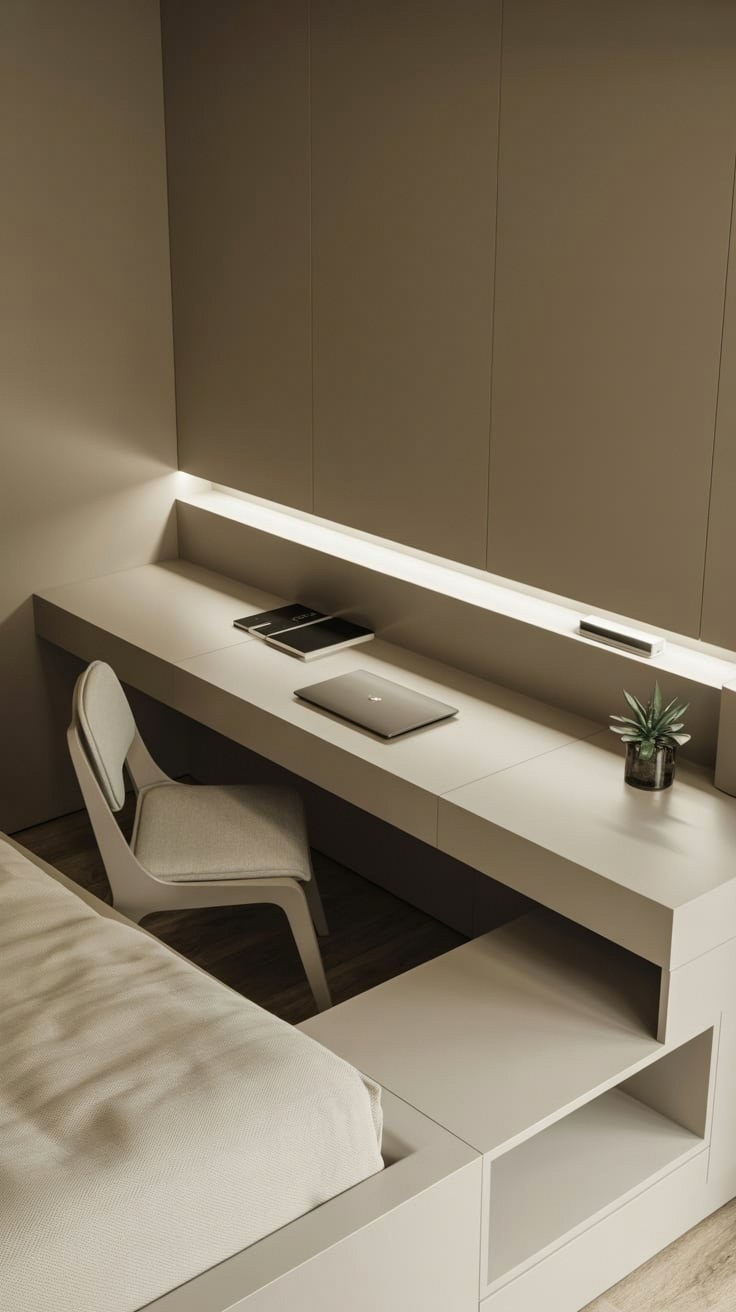 Elevate your study space with a sleek, modern white floating desk, an ideal choice for bedroom office desk ideas. Its integrated smart lighting creates a clean, minimalist look, enhancing the perception of space.