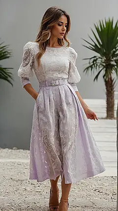 The picture shows a woman rocking a gorgeous lavender dress with a belt that looks like it could have been plucked straight out of a fashion magazine. It’s not just your average maxi dress, though – this one has a cool, breezy look that’s perfect for the cooler months. The delicate floral pattern on the dress is subtle, and the flowing fabric makes it look like she’s ready to take on the fall season in style. And hey, those shoes? They’re giving us serious “I’m ready for anything” vibes!