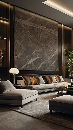 The whole room has a cool vibe, with the dark marble wall and the sleek furniture. That marble looks like it has a cool story to tell, like a secret map hidden in the veins of the stone. It’s the kind of room that makes you feel like a movie star, even if you’re just in your pajamas! It’s like stepping into a magazine photo! You could almost imagine a fancy party happening here, with sparkling champagne and guests dressed in their best outfits! Maybe you’ll even get to be invited. 😉