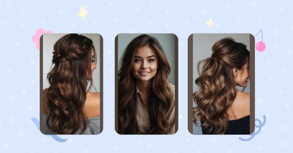 This hairstyle is like a magic trick for your hair! It’s a half-up, half-down style that’s super easy to do, but looks totally fancy. Imagine your hair is like a mermaid’s tail, and you’re taking a little bit of the top and tying it up to make it look even more beautiful. It’s perfect for a party or just a casual day out.