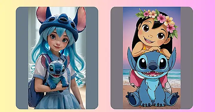Look at these two cuties, Stitch and Angel, practically floating on cloud nine! They’re having a super sweet nose-to-nose moment, maybe gossiping about Lilo or deciding whose turn it is to chase the bubbles. With their giant, sparkling eyes and big, floppy ears, they’re melting hearts faster than a popsicle on a hot day. This isn’t just a picture; it’s basically a masterclass in ‘awww-worthiness,’ proving that even mischievous aliens know how to be absolutely adorable.