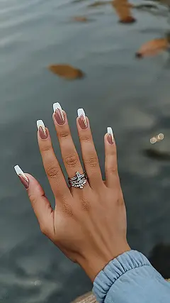 This picture shows someone with some seriously fancy nails! They’re long and pointy, with a white tip and a little touch of gold. It’s like a fancy French manicure, but with extra pizzazz. The burgundy color makes them look super cool and elegant, and the gold adds a touch of bling. The person’s ring is also pretty amazing – all sparkly and dazzling. It’s no wonder they’re showing off their nails and ring by the water!