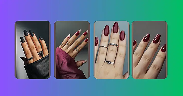 This picture shows a hand with some seriously stylish nail paint. It’s a deep, rich red that’s perfect for a night out or a special occasion. But what really catches your eye is the ring! It’s a beautiful piece of jewelry with a sparkling gemstone that makes the whole hand look super fancy.