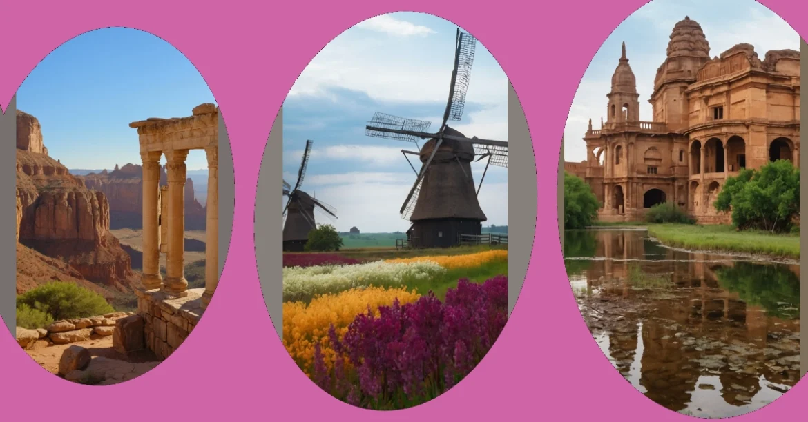 The image shows a classic European scene: two windmills standing proudly in a field of wildflowers. Imagine the scent of the fresh air, the gentle breeze pushing the windmill blades, and the colorful flowers swaying in the sunlight. This is the kind of picture that makes you want to pack your bags and visit Europe!