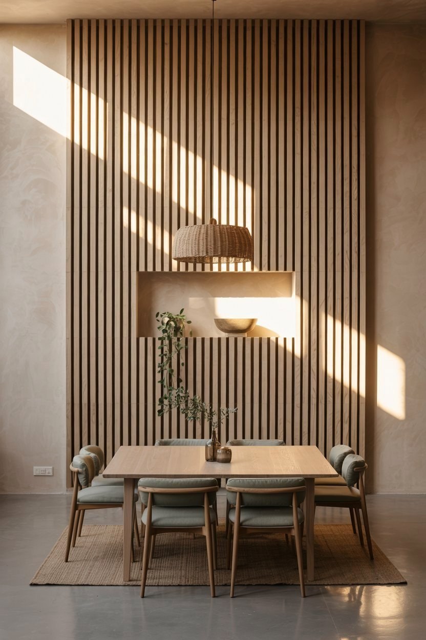 Transform your dining room with vertical wood slat accent walls, adding architectural interest and natural warmth. These small wood slats create a rhythmic, eye-catching feature against a soft taupe backdrop, elevating your space.