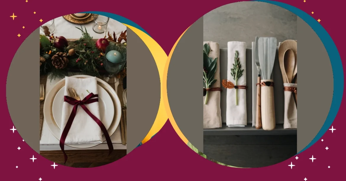 This picture shows some seriously stylish Thanksgiving table settings. Forget fussy floral arrangements! These simple, nature-inspired place settings are super cute and way less work. Imagine impressing your family with these effortlessly chic napkins and utensils – they’re like tiny, perfectly-wrapped Thanksgiving presents just waiting to be unwrapped (but please, don’t actually unwrap your cutlery!). You can totally copy this look, even if your artistic skills are about as impressive as a wobbly pumpkin pie.