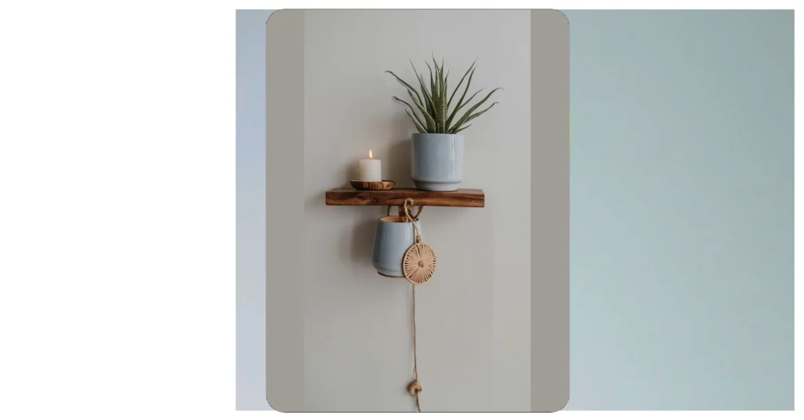 This picture shows some seriously cool wooden home decor! See that awesome wooden shelf holding a little plant and a candle? It’s like a mini zen garden, but way more stylish. And check out that hanging planter – it’s got a cute little woven sun thingy hanging down, too. It’s all very peaceful and relaxing, perfect for your room if you want a little bit of calm amidst the homework chaos.