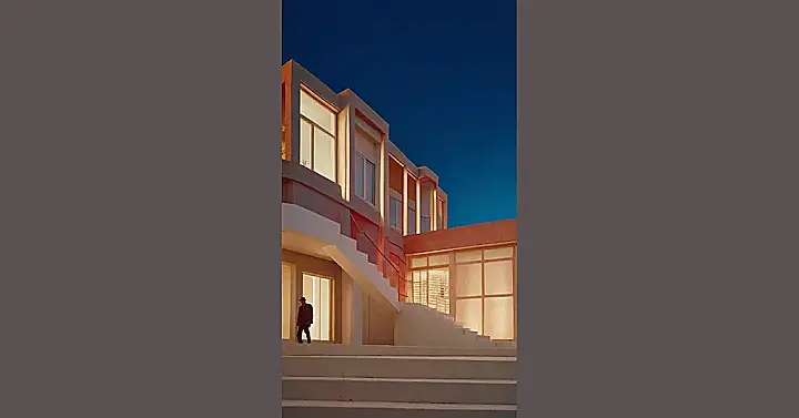 This house is like something out of a movie! It’s got that modern, sleek look, with big windows that probably have amazing views. The pink walls are a little unexpected, but hey, maybe the owner just loves the color! This house screams “I’ve got my life figured out,” and that’s pretty cool.