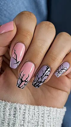 Get ready to seriously nail your Halloween look with these spooky-cute designs! Forget boring orange and black; these pastel pink and purple nails are giving us major haunted forest vibes, but make it fashion. Those intricate black patterns look like tiny, twisty tree branches reaching out, or maybe even cracks from a ghost-infested mansion – perfect for adding a touch of eerie elegance without totally freaking out your grandma when you reach for another piece of candy corn. You’ll be the coolest ghoul on the block with nails this stylish!