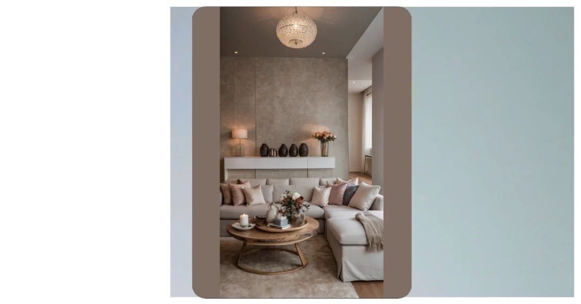 Stepping into this living room feels like entering a calm, luxurious cloud where everything is perfectly placed. That huge, comfy-looking couch, with its army of fluffy pillows in all the right shades of beige and blush, practically begs you to kick off your shoes and sink right in. It’s so neat, you half expect a tiny butler to pop out and offer you a fancy sparkling water. And check out that chandelier – it looks like a disco ball that grew up and got seriously sophisticated, making even spilled juice look elegant.