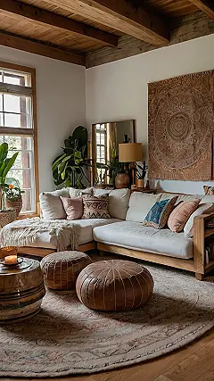 **Paragraph 1:** Whoa, check out this living room! It’s seriously giving major “boho vibes.” Imagine sinking into that comfy sectional sofa, surrounded by cozy throw blankets and pillows with cool patterns. That giant woven mirror is awesome – it’s like something straight out of a fairytale. The whole place is super relaxed and warm, like a comfy hug from your favorite blanket. You could totally spend an entire weekend here, reading books, binge-watching shows, and just chilling out. It’s the perfect blend of cozy and stylish.