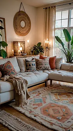 **Paragraph 1:** Whoa, check out this living room! It’s seriously giving major “boho vibes.” Imagine sinking into that comfy sectional sofa, surrounded by cozy throw blankets and pillows with cool patterns. That giant woven mirror is awesome – it’s like something straight out of a fairytale. The whole place is super relaxed and warm, like a comfy hug from your favorite blanket. You could totally spend an entire weekend here, reading books, binge-watching shows, and just chilling out. It’s the perfect blend of cozy and stylish.