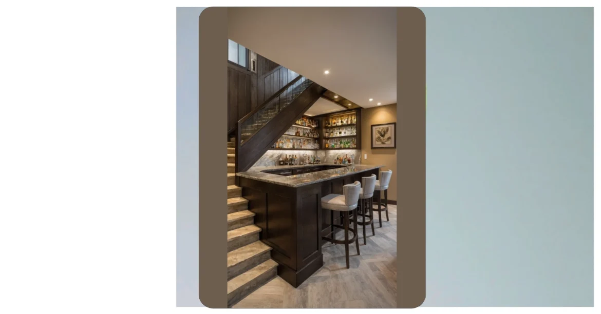 This house bar design packs in a ton of storage, too, with shelves absolutely loaded with bottles that sparkle under the lights, looking almost like a colorful collection of potions. The cool, stone-like countertop looks ready for mixing up anything from lemonade to grown-up drinks. It shows that with a little imagination, even a weird corner can become the highlight of your home, proving that sometimes the coolest stuff is hidden right under your nose… or, you know, the stairs.