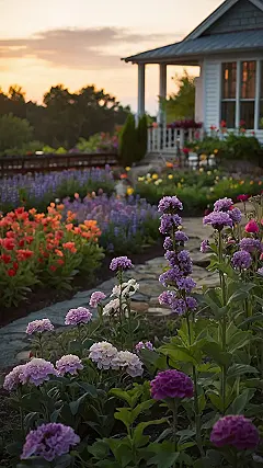 Imagine strolling along that stone pathway, the sunset painting the sky in warm hues as you admire the incredible variety of flowers. It’s like Mother Nature decided to have a flower-power competition, and everyone’s a winner! I bet the air smells absolutely divine – all those gorgeous blooms releasing their sweet fragrance. Makes you wish you could bottle up the entire sunset and the garden’s perfume, doesn’t it?