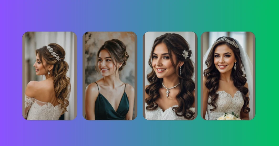 Getting ready for a big day, especially a wedding, isn’t just about putting on a fancy dress – it’s a full-on glow-up mission! This beautiful bride-to-be shows us how it’s done, making “bed head” a distant, blurry memory. Her hair isn’t just styled; it’s a masterpiece of soft waves and a chic updo, cleverly holding that sparkly hairpiece like it was born there. And let’s not forget the makeup! It’s that perfect blend of “I woke up like this” and “actually, it took three hours and a team of experts,” giving her eyes that extra sparkle and her smile that “I’m about to have the best day ever” vibe.