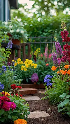 This flower garden is like a rainbow exploded! So many colors, it’s almost dizzying! Imagine relaxing on that little wooden bench, sipping lemonade, and letting all the pretty petals and sweet scents wash over you. It’s the perfect spot for a secret garden tea party with your friends or just a quiet moment to yourself, surrounded by the happy chatter of bees buzzing from bloom to bloom. It’s like a tiny slice of heaven, right there in your backyard!