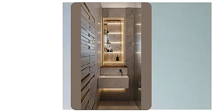 This bathroom proves that small doesn’t mean boring! Just look at that gorgeous marble and gold – it’s like stepping into a fancy spa, but in your own house (minus the possibly judgmental masseuse). Even though it’s teeny-tiny, the clever shelving and lighting make everything feel open and luxurious. It’s the perfect example of how to maximize space and add a touch of sparkle to a small bathroom – think less “cramped closet” and more “stylish sanctuary.”