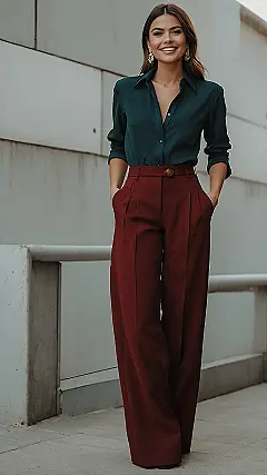 Behold, the queen of comfort and style! This look just screams “I woke up like this, feeling fantastic, and also, my legs have plenty of room to party.” Those magnificent wide leg trousers in a rich maroon aren’t just incredibly chic, they probably feel like wearing secret pajama pants while looking absolutely pulled together. You could practically store a whole lunch (or perhaps a very enthusiastic pet squirrel) in there, and no one would be the wiser. She’s got that confident grin because she knows she’s both slaying the fashion game and probably super comfy.