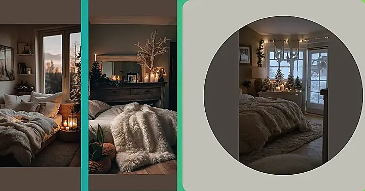 This picture makes me want to curl up in a big, comfy bed with a good book and a mug of hot cocoa! It’s like a winter wonderland in a bedroom, with fluffy blankets and pillows, warm candlelight, and a window that shows a snowy scene outside.