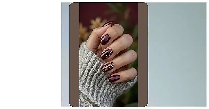 But hold on, because one of these nails isn’t just maroon; it’s practically wearing a tiny crown! That fancy gold design is like the VIP section of your manicure, making your finger feel super special and totally Instagram-worthy. While the other nails are slaying with their solid color, this one is out here showing off its intricate, royal patterns, proving you don’t need all ten fingers to be flashy. It’s the perfect way to add a little “oomph” and show off your creative side without going full sparkle overload – just enough glam to make heads turn.