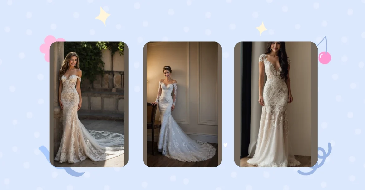 Looking at this amazing ‘fit and flare’ wedding dress, you can practically hear it whisper, “Confidence is my middle name!” This style is all about showing off your fantastic shape, hugging you in all the right places like it was custom-made by a fairy godmother with impeccable taste. Those gorgeous lace sleeves and the off-the-shoulder look? Total chef’s kiss! You’d feel like a celebrity on the red carpet, but way more comfortable and probably with less paparazzi (unless your aunt Sally counts).