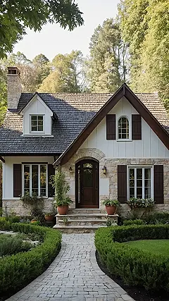 Check out this place – it’s like a cottage from a fairy tale got a super stylish upgrade! With its cool mix of sturdy stone walls and crisp white siding, plus a roof that looks like it’s made of giant, cozy shingles, this definitely isn’t your average, boring square house. It’s got those charming dark shutters that probably wink at you when you walk by, and an arched front door that practically invites you in for a cup of hot chocolate. Seriously, who needs a mansion when you can have a house that looks this unique and makes you feel like you’ve stumbled into a secret garden?